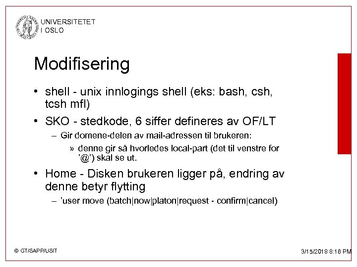 UNIVERSITETET I OSLO Modifisering • shell - unix innlogings shell (eks: bash, csh, tcsh mfl) • SKO - stedkode, 6 siffer defineres av OF/LT – Gir domene-delen av mail-adressen til brukeren: » denne gir så hvorledes local-part (det til venstre for ’@’) skal se ut. • Home - Disken brukeren ligger på, endring av denne betyr flytting – ’user move (batch|now|platon|request - confirm|cancel) © GT/SAPP/USIT 3/15/2018 8: 16 PM