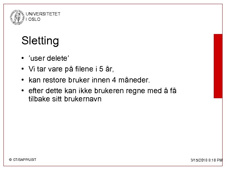 UNIVERSITETET I OSLO Sletting • • ’user delete’ Vi tar vare på filene i 5 år, kan restore bruker innen 4 måneder. efter dette kan ikke brukeren regne med å få tilbake sitt brukernavn © GT/SAPP/USIT 3/15/2018 8: 16 PM