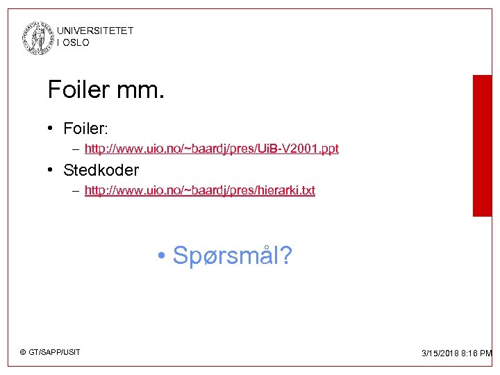 UNIVERSITETET I OSLO Foiler mm. • Foiler: – http: //www. uio. no/~baardj/pres/Ui. B-V 2001. ppt • Stedkoder – http: //www. uio. no/~baardj/pres/hierarki. txt • Spørsmål? © GT/SAPP/USIT 3/15/2018 8: 16 PM