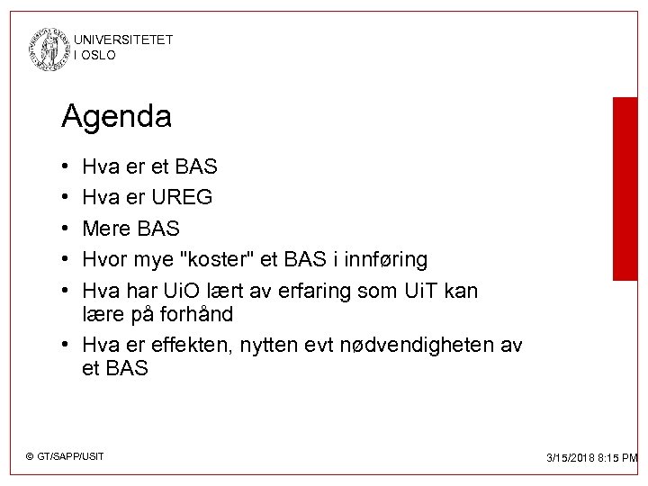 UNIVERSITETET I OSLO Agenda • • • Hva er et BAS Hva er UREG Mere BAS Hvor mye "koster" et BAS i innføring Hva har Ui. O lært av erfaring som Ui. T kan lære på forhånd • Hva er effekten, nytten evt nødvendigheten av et BAS © GT/SAPP/USIT 3/15/2018 8: 15 PM