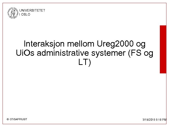 UNIVERSITETET I OSLO Data fra Ureg 2000 • FS får/vil ha – Har studenten gjennomført godkjent kontokurs? – Studenters emailadresse. • LT mottar i dag ingen data fra Ureg 2000 • I praksis fungerer Ureg 2000 som “vaktbikkje” for å sikre samsvar mellom FS og LT © GT/SAPP/USIT 3/15/2018 8: 16 PM