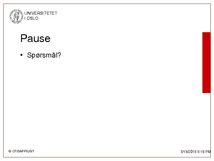 UNIVERSITETET I OSLO Pause • Spørsmål? © GT/SAPP/USIT 3/15/2018 8: 16 PM