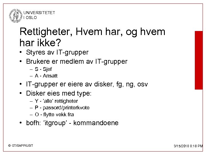 UNIVERSITETET I OSLO Rettigheter, Hvem har, og hvem har ikke? • Styres av IT-grupper • Brukere er medlem av IT-grupper – S - Sjef – A - Ansatt • IT-grupper er eiere av disker, fg, ng, osv • Disker eies med type: – Y - ’alle’ rettigheter – P - passord/printerkvote – O - flytte vekk fra • bofh: ’itgroup’ - kommandoene © GT/SAPP/USIT 3/15/2018 8: 16 PM