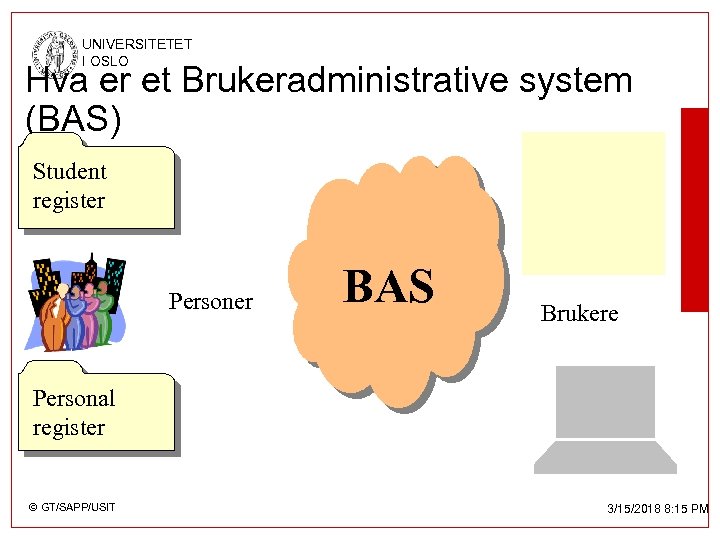 UNIVERSITETET I OSLO Hva er et Brukeradministrative system (BAS) Student register Personer BAS Brukere Personal register © GT/SAPP/USIT 3/15/2018 8: 15 PM