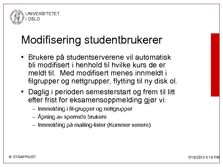 UNIVERSITETET I OSLO Modifisering studentbrukerer • Brukere på studentserverene vil automatisk bli modifisert i henhold til hvilke kurs de er meldt til. Med modifisert menes innmeldt i filgrupper og nettgrupper, flytting til ny disk ol. • Daglig i perioden semesterstart og frem til litt efter frist for eksamensoppmelding gjør vi: – Innmelding i fil-grupper og nettgrupper – Åpning av sperrede brukere – Innmelding på mailing-lister (Kommer senere) © GT/SAPP/USIT 3/15/2018 8: 16 PM