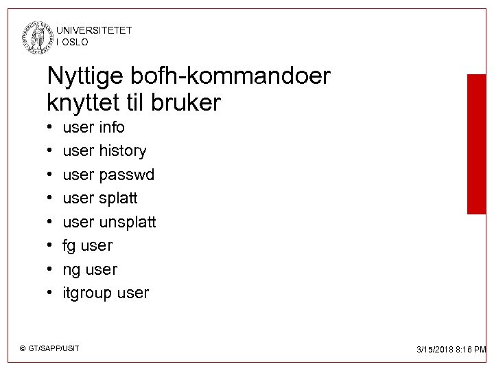 UNIVERSITETET I OSLO Nyttige bofh-kommandoer knyttet til bruker • • user info user history user passwd user splatt user unsplatt fg user ng user itgroup user © GT/SAPP/USIT 3/15/2018 8: 16 PM