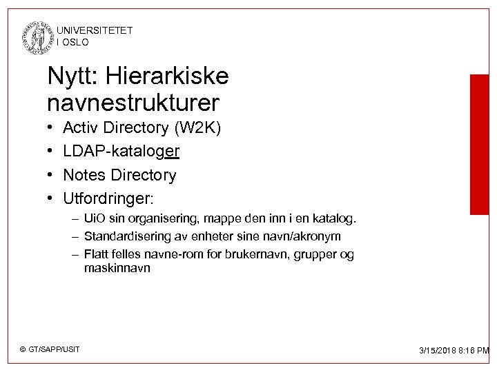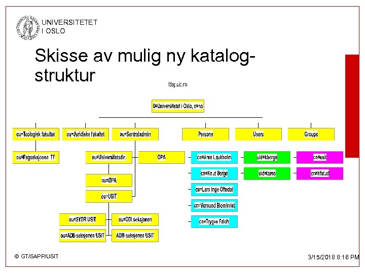 UNIVERSITETET I OSLO Nytt: Hierarkiske navnestrukturer • • Activ Directory (W 2 K) LDAP-kataloger Notes Directory Utfordringer: – Ui. O sin organisering, mappe den inn i en katalog. – Standardisering av enheter sine navn/akronym – Flatt felles navne-rom for brukernavn, grupper og maskinnavn © GT/SAPP/USIT 3/15/2018 8: 16 PM