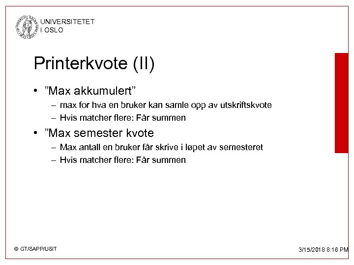 UNIVERSITETET I OSLO Printerkvote (II) • ”Max akkumulert” – max for hva en bruker kan samle opp av utskriftskvote – Hvis matcher flere: Får summen • ”Max semester kvote – Max antall en bruker får skrive i løpet av semesteret – Hvis matcher flere: Får summen © GT/SAPP/USIT 3/15/2018 8: 16 PM