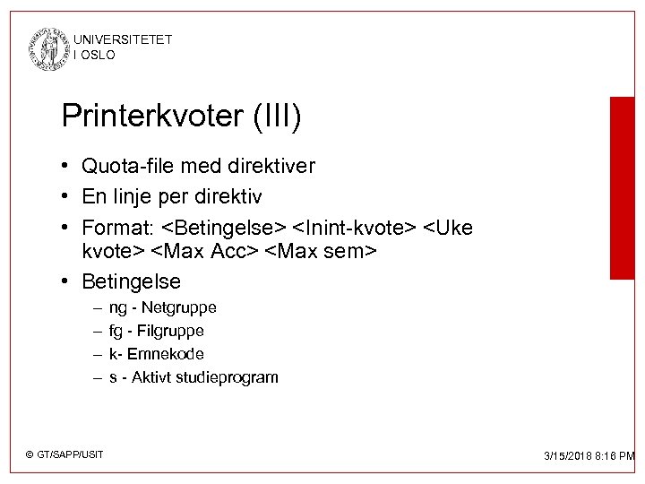 UNIVERSITETET I OSLO Printerkvoter (III) • Quota-file med direktiver • En linje per direktiv • Format: <Betingelse> <Inint-kvote> <Uke kvote> <Max Acc> <Max sem> • Betingelse – – © GT/SAPP/USIT ng - Netgruppe fg - Filgruppe k- Emnekode s - Aktivt studieprogram 3/15/2018 8: 16 PM