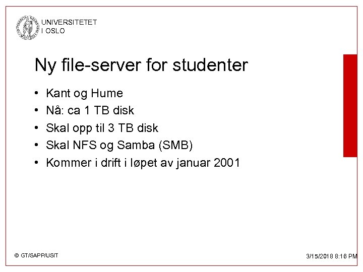 UNIVERSITETET I OSLO Ny file-server for studenter • • • Kant og Hume Nå: ca 1 TB disk Skal opp til 3 TB disk Skal NFS og Samba (SMB) Kommer i drift i løpet av januar 2001 © GT/SAPP/USIT 3/15/2018 8: 16 PM