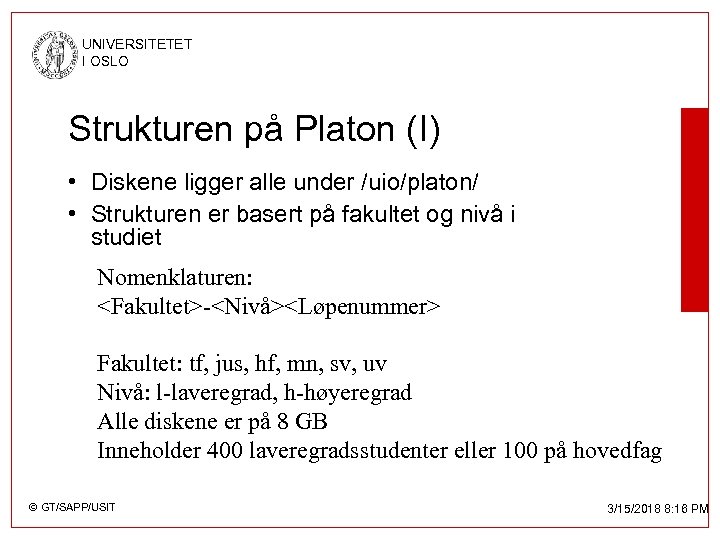 UNIVERSITETET I OSLO Strukturen på Platon (I) • Diskene ligger alle under /uio/platon/ • Strukturen er basert på fakultet og nivå i studiet Nomenklaturen: <Fakultet>-<Nivå><Løpenummer> Fakultet: tf, jus, hf, mn, sv, uv Nivå: l-laveregrad, h-høyeregrad Alle diskene er på 8 GB Inneholder 400 laveregradsstudenter eller 100 på hovedfag © GT/SAPP/USIT 3/15/2018 8: 16 PM