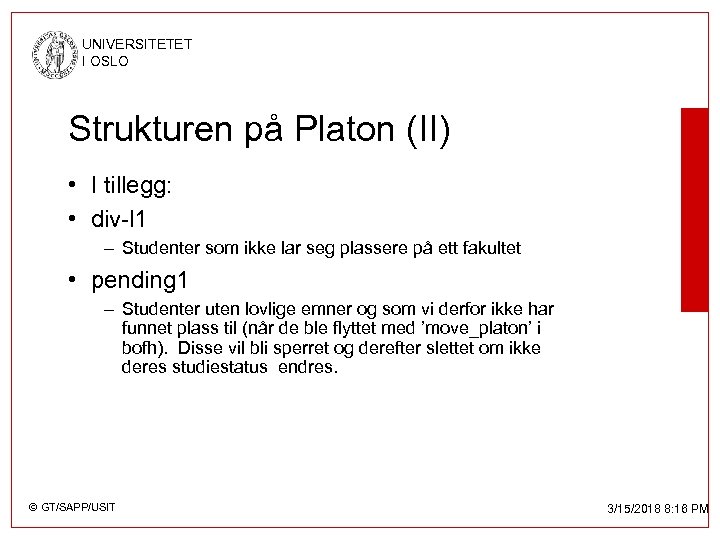 UNIVERSITETET I OSLO Strukturen på Platon (II) • I tillegg: • div-l 1 – Studenter som ikke lar seg plassere på ett fakultet • pending 1 – Studenter uten lovlige emner og som vi derfor ikke har funnet plass til (når de ble flyttet med ’move_platon’ i bofh). Disse vil bli sperret og derefter slettet om ikke deres studiestatus endres. © GT/SAPP/USIT 3/15/2018 8: 16 PM