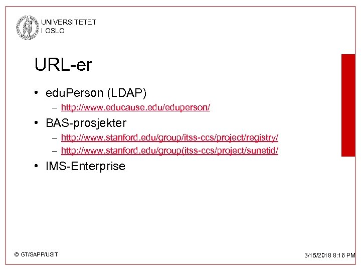 UNIVERSITETET I OSLO URL-er • edu. Person (LDAP) – http: //www. educause. edu/eduperson/ • BAS-prosjekter – http: //www. stanford. edu/group/itss-ccs/project/registry/ – http: //www. stanford. edu/group(itss-ccs/project/sunetid/ • IMS-Enterprise © GT/SAPP/USIT 3/15/2018 8: 16 PM