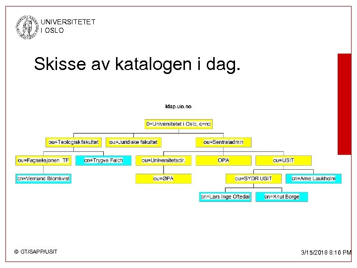 UNIVERSITETET I OSLO Hva har Ui. O idag? • ldap. uio. no (alias: x 500. uio. no) • Inneholder (Objekter) – Enheter ved Ui. O hentet fra LT – Personer ved Ui. O, hentet fra LT » Dvs Ansatte + bilagslønn (løsarbeidere) – Studenter? » Kun hvis de har gitt oss lov via semesterregistreringen © GT/SAPP/USIT 3/15/2018 8: 16 PM