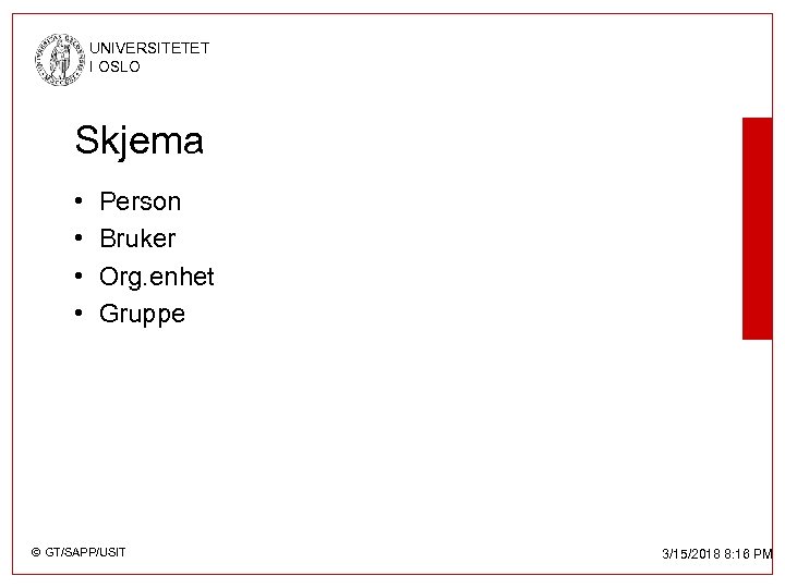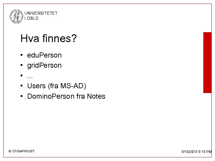 UNIVERSITETET I OSLO Hva finnes? • • • edu. Person grid. Person. . . Users (fra MS-AD) Domino. Person fra Notes © GT/SAPP/USIT 3/15/2018 8: 16 PM