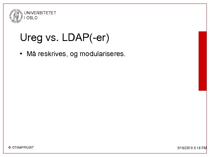 UNIVERSITETET I OSLO Ureg vs. LDAP(-er) • Må reskrives, og modulariseres. © GT/SAPP/USIT 3/15/2018 8: 16 PM