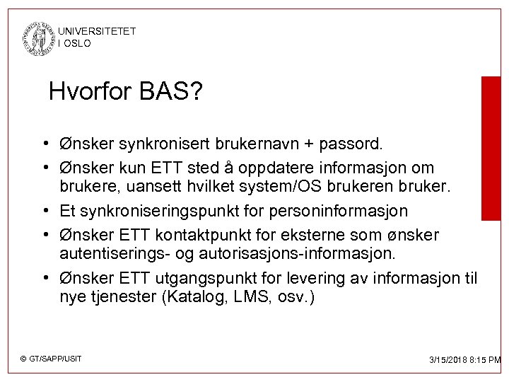 UNIVERSITETET I OSLO Hvorfor BAS? • Ønsker synkronisert brukernavn + passord. • Ønsker kun ETT sted å oppdatere informasjon om brukere, uansett hvilket system/OS brukeren bruker. • Et synkroniseringspunkt for personinformasjon • Ønsker ETT kontaktpunkt for eksterne som ønsker autentiserings- og autorisasjons-informasjon. • Ønsker ETT utgangspunkt for levering av informasjon til nye tjenester (Katalog, LMS, osv. ) © GT/SAPP/USIT 3/15/2018 8: 15 PM