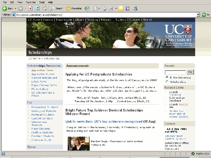 Applying for scholarships sources of information § Web: www. canterbury. ac. nz/scholarships References/links to other websites § Check monthly ‘Scholarships Noticeboard’ and ‘Latest News’ § Check with Colleges and Departments/ Supervisors