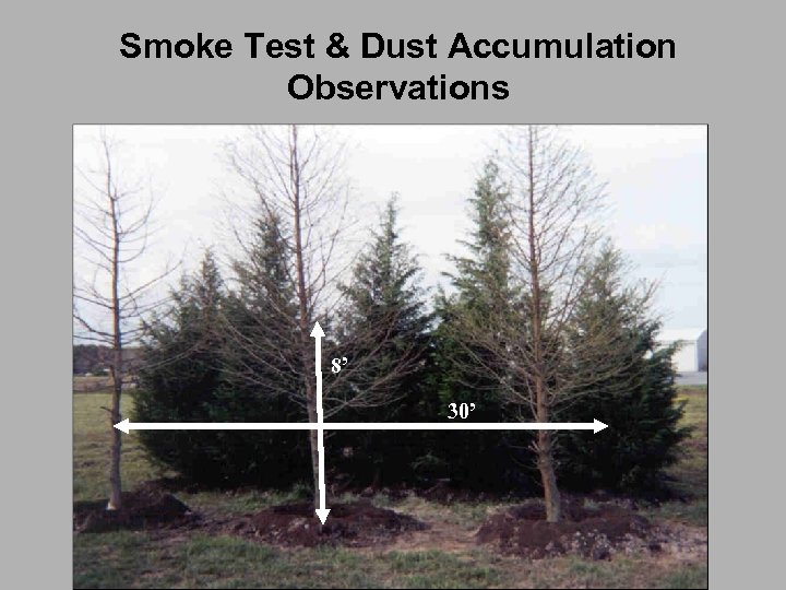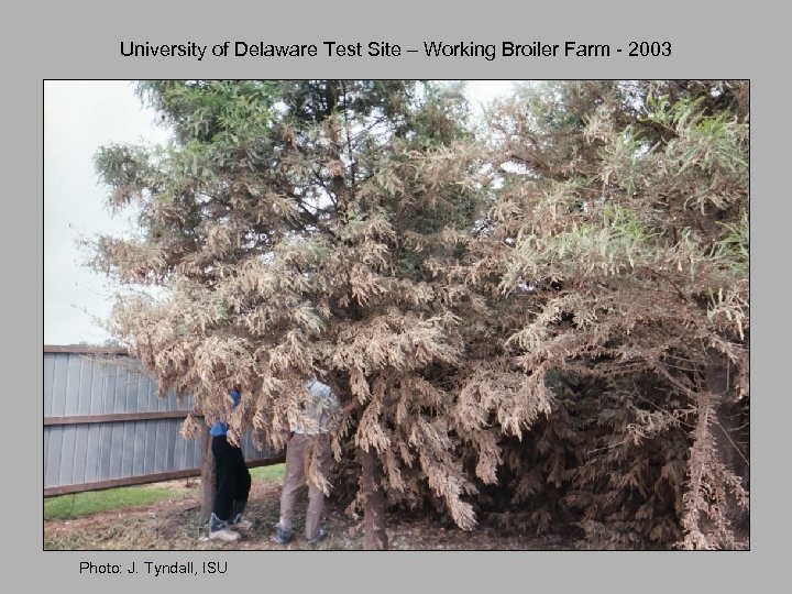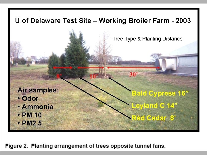 U of Delaware Test Site – Working Broiler Farm - 2003 Tree Type & Planting Distance Air samples: • Odor • Ammonia • PM 10 • PM 2. 5 Bald Cypress 16” Leyland C 14” Red Cedar 8’