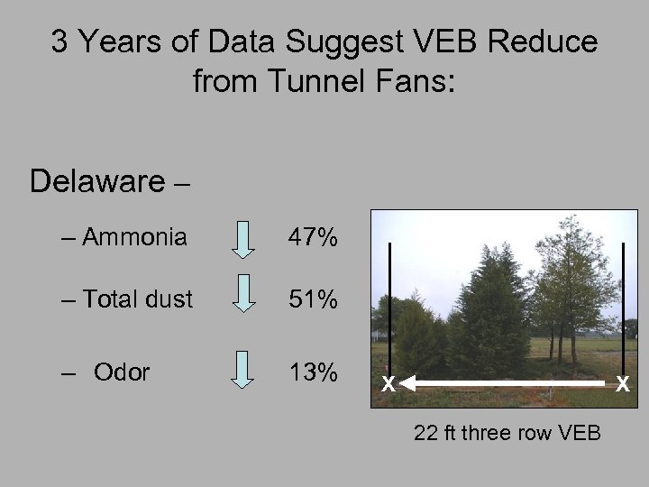 3 Years of Data Suggest VEB Reduce from Tunnel Fans: Delaware – – Ammonia 47% – Total dust 51% – Odor 13% X X 22 ft three row VEB