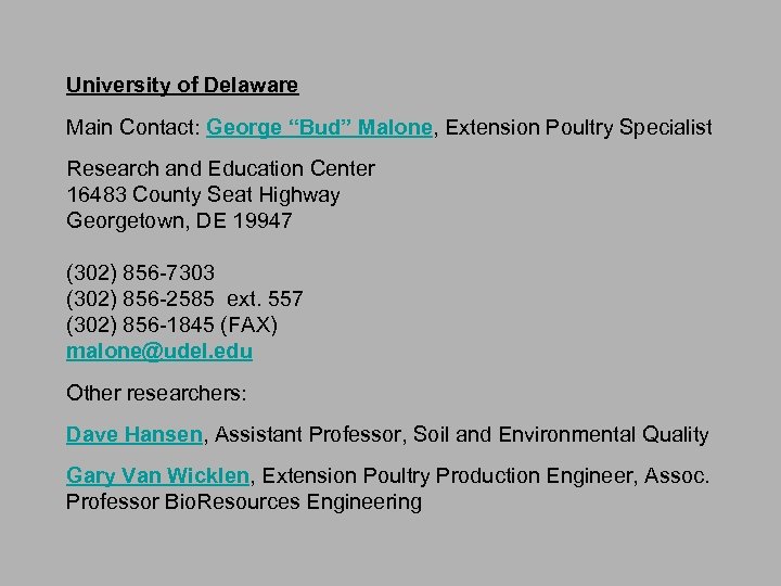 University of Delaware Main Contact: George “Bud” Malone, Extension Poultry Specialist Research and Education Center 16483 County Seat Highway Georgetown, DE 19947 (302) 856 -7303 (302) 856 -2585 ext. 557 (302) 856 -1845 (FAX) malone@udel. edu Other researchers: Dave Hansen, Assistant Professor, Soil and Environmental Quality Gary Van Wicklen, Extension Poultry Production Engineer, Assoc. Professor Bio. Resources Engineering