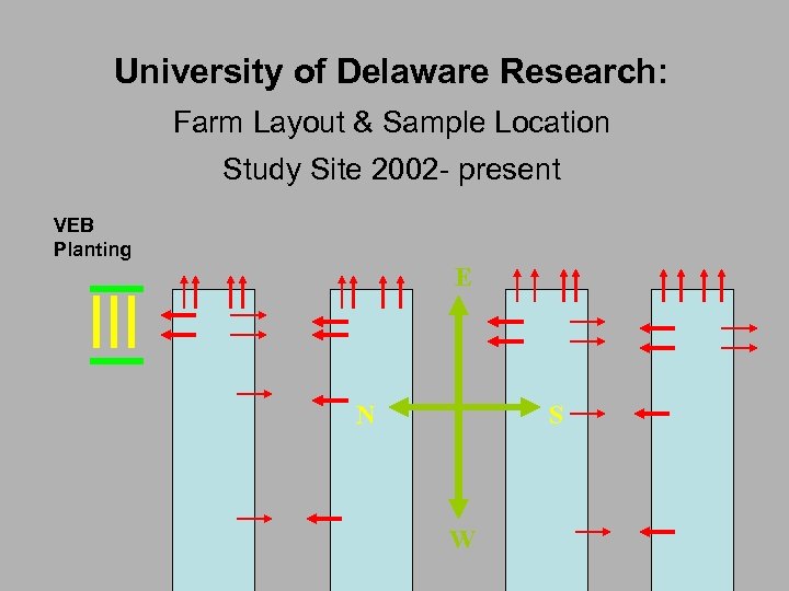 University of Delaware Research: Farm Layout & Sample Location Study Site 2002 - present VEB Planting E N S W