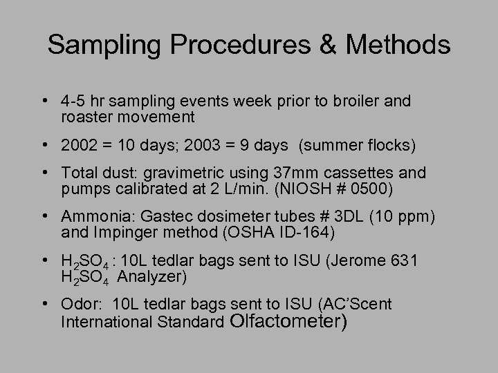 Sampling Procedures & Methods • 4 -5 hr sampling events week prior to broiler and roaster movement • 2002 = 10 days; 2003 = 9 days (summer flocks) • Total dust: gravimetric using 37 mm cassettes and pumps calibrated at 2 L/min. (NIOSH # 0500) • Ammonia: Gastec dosimeter tubes # 3 DL (10 ppm) and Impinger method (OSHA ID-164) • H 2 SO 4 : 10 L tedlar bags sent to ISU (Jerome 631 H 2 SO 4 Analyzer) • Odor: 10 L tedlar bags sent to ISU (AC’Scent International Standard Olfactometer)