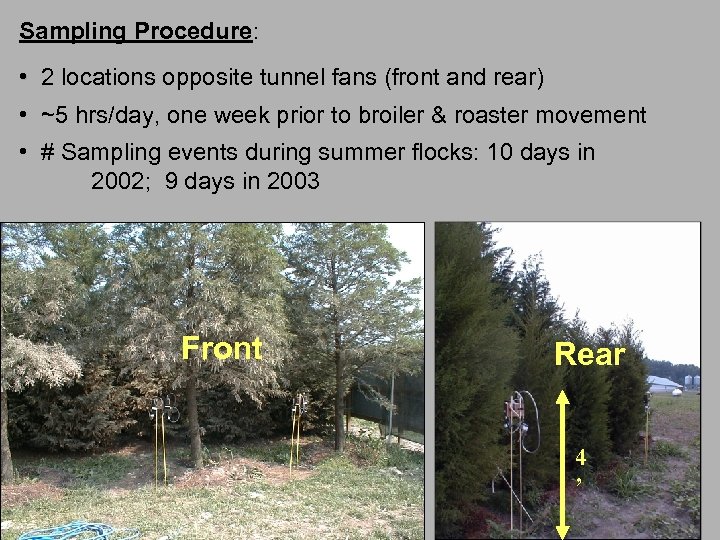 Sampling Procedure: • 2 locations opposite tunnel fans (front and rear) • ~5 hrs/day, one week prior to broiler & roaster movement • # Sampling events during summer flocks: 10 days in 2002; 9 days in 2003 Front Rear 4 ’