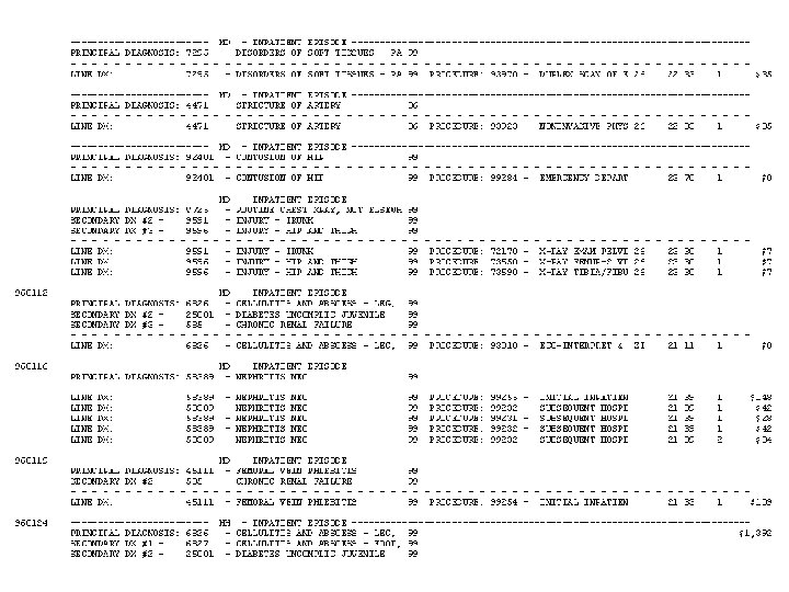 Small Group Exercises (Part 1 of a 2 Part Exercise) • What ‘information’ can health insurance data provide? • Name 2 major strengths and weaknesses of claims data as a management tool. • Poof: You’re a Blue Cross Blue Shield CIO. – You have $50 M to spend to upgrade your claims system. – It costs $1 M per text/character to enhance your data. – What data fields would you add? – Are there any data fields you would consider deleting or optimizing?