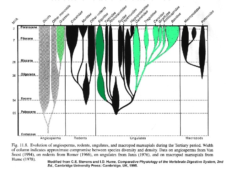 Evolutionary Adaptations for Digestion Shape & arrangement of teeth: From Wessells & Hopson, Biology, (Random House: 1988), 817, 822, 819. Carnivore Omnivore Herbivore Contents of saliva: Contains amylases in cloven hoofed animals, rodents, rabbits, dogs, & primates. High content of HCO 3 -2 & PO 4 -3 in herbivores. Venoms & proteases in some reptiles & invertebrates. Form & function of the gut.