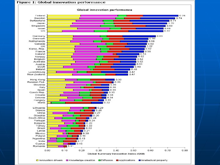 Global Innovation Scoreboard 2008 n n Finland, Sweden, Switzerland, Japan, the US, Singapore and Israel are the global innovation leaders. The group of next-best performers includes Germany, Denmark, Netherlands, Canada, the UK, Republic of Korea, France, Iceland, Norway, Belgium, Australia, Austria, Ireland, Luxembourg and New Zealand. The group of follower countries includes the Hong Kong, Russian Federation, Slovenia, Italy, Spain, Czech Republic, Croatia, Estonia, Hungary and Malta. The group of lagging countries includes Lithuania, Greece, China, Slovakia, South Africa, Portugal, Bulgaria, Turkey, Brazil, Latvia, Mexico, Poland, Argentina, India, Cyprus and Romania.