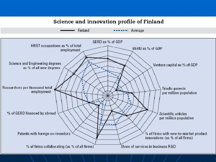 Finnish innovation system/policy SWOT STRENGTS n n n Education Commitment & continuity Co-operation & competition Industry share of R&D investments Proactive and client-oriented public innovation services (funding, expert) Public R&D funding with strong incentives for co-operation and risktaking WEAKNESSES n n n OPPORTUNITIES n n n More coherent and strategic national policies (foresight insight policy) Stronger focusing of public R&D resources Going beyond “industrial innovation”: Promotion of innovation in private and public services Market-pulled innovation stimulation Active participation in major EU R&D programmes and platforms Going beyond EU: Active linkage with global innovation hotspots Small absolute volumes in R&D (3, 5% GDP = 5, 5 bn €, < 1% global R&D) Dependence on global developments Low foreign direct investments Low international researcher mobility Small number of growth-oriented enterprises Small venture capital volumes for startup and early growth-phases THREATS n n Dominance of one sector (ICT) and one company in business R&D Risk of declining business R&D expenditure Businesses increasingly move their operations abroad, including R&D Loosing focus: Participation in too many projects with scarce resources