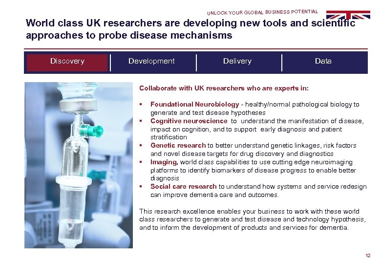 UNLOCK YOUR GLOBAL BUSINESS POTENTIAL The UK offers a fully integrated dementia discovery, development and delivery ecosystem DISCOVERY DEVELOPMENT World class UK researchers are developing new tools and scientific approaches to probe disease mechanisms A national research infrastructure and specialist clinical research networks support translation and access to patients for diagnosis and treatment Data resources to enable research Robust regulatory and health technology assessments ensure portability of your products across the world NHS access points facilitate uptake and diffusion of your products and services directly to patients Research funders and charities build capabilities and directly support academic research and partnership with industry DATA DELIVERY The UK dementia ecosystems is underpinned by data to drive your discovery through to delivery of care Data to drive clinical translation Anonymised data to deliver and monitor real-world outcomes 11