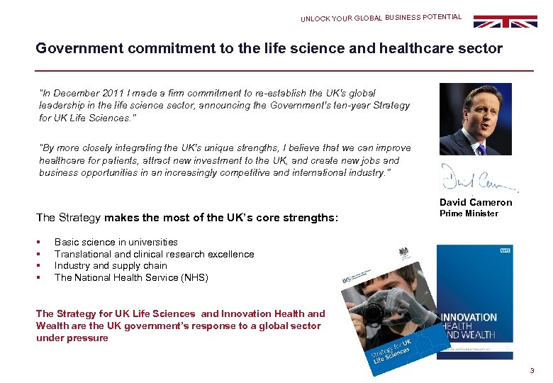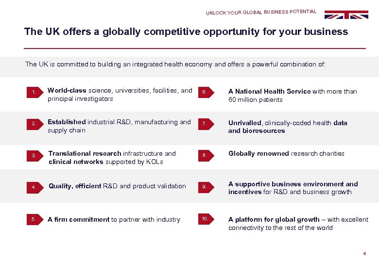 UNLOCK YOUR GLOBAL BUSINESS POTENTIAL Government commitment to the life science and healthcare sector “In December 2011 I made a firm commitment to re-establish the UK's global leadership in the life science sector, announcing the Government's ten-year Strategy for UK Life Sciences. ” “By more closely integrating the UK's unique strengths, I believe that we can improve healthcare for patients, attract new investment to the UK, and create new jobs and business opportunities in an increasingly competitive and international industry. ” David Cameron The Strategy makes the most of the UK’s core strengths: § § Prime Minister Basic science in universities Translational and clinical research excellence Industry and supply chain The National Health Service (NHS) The Strategy for UK Life Sciences and Innovation Health and Wealth are the UK government’s response to a global sector under pressure 3