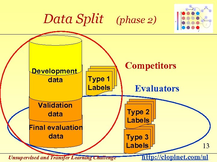 Data Split Development data Validation data Final evaluation data Unsupervised and Transfer Learning Challenge (phase 1) Competitors Evaluators Type 2 Labels Type 3 Labels 12 http: //clopinet. com/ul