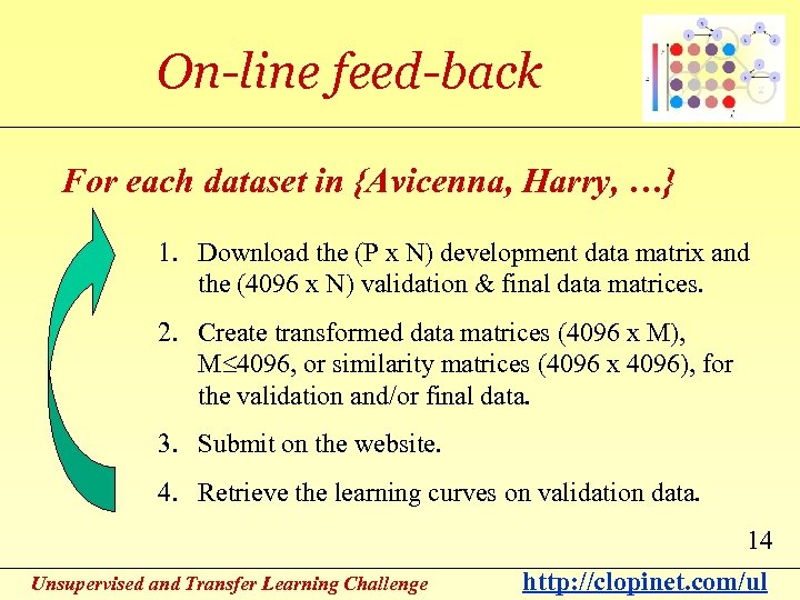 Data Split Development data (phase 2) Competitors Type 1 Labels Validation data Final evaluation data Unsupervised and Transfer Learning Challenge Evaluators Type 2 Labels Type 3 Labels 13 http: //clopinet. com/ul