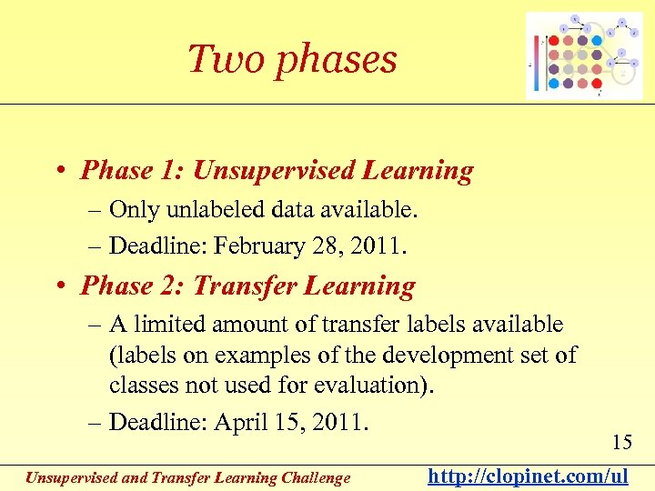 Two phases • Phase 1: Unsupervised Learning – Only unlabeled data available. – Deadline: February 28, 2011. • Phase 2: Transfer Learning – A limited amount of transfer labels available (labels on examples of the development set of classes not used for evaluation). – Deadline: April 15, 2011. Unsupervised and Transfer Learning Challenge 15 http: //clopinet. com/ul