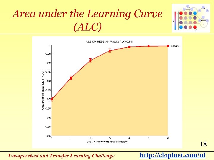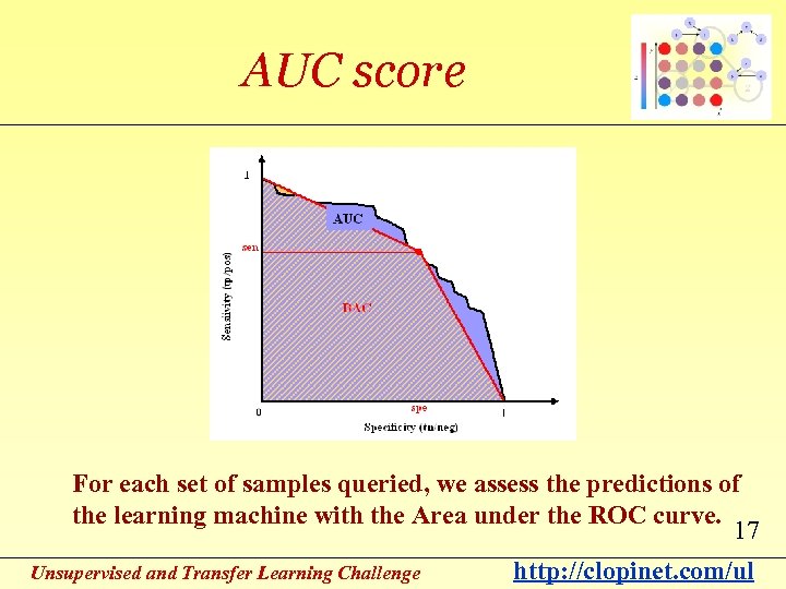 AUC score For each set of samples queried, we assess the predictions of the learning machine with the Area under the ROC curve. 17 Unsupervised and Transfer Learning Challenge http: //clopinet. com/ul