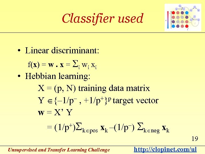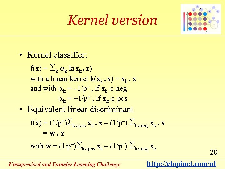 Classifier used • Linear discriminant: f(x) = w. x = Si wi xi • Hebbian learning: X = (p, N) training data matrix Y {– 1/p– , +1/p+}p target vector w = X’ Y = (1/p+)Sk pos xk –(1/p–) Sk neg xk 19 Unsupervised and Transfer Learning Challenge http: //clopinet. com/ul