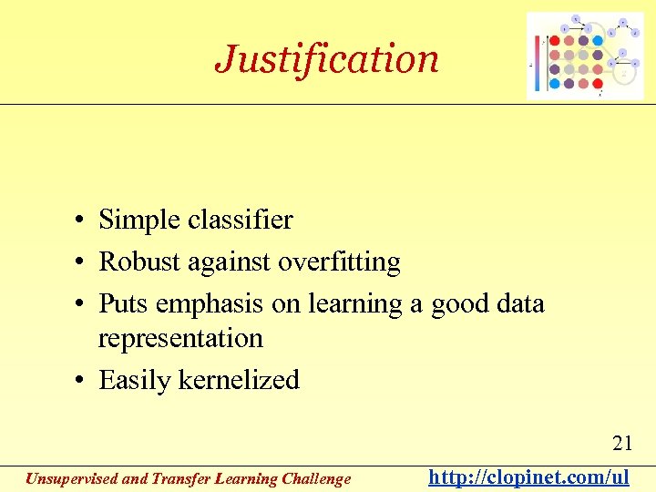Justification • Simple classifier • Robust against overfitting • Puts emphasis on learning a good data representation • Easily kernelized 21 Unsupervised and Transfer Learning Challenge http: //clopinet. com/ul