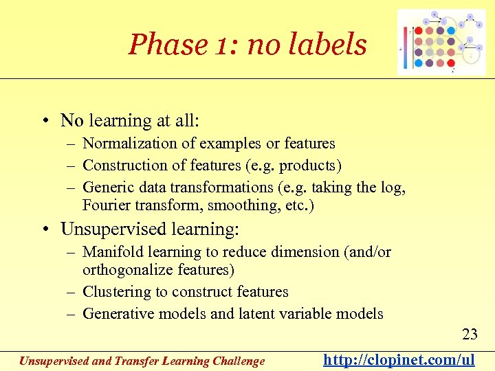Phase 1: no labels • No learning at all: – Normalization of examples or features – Construction of features (e. g. products) – Generic data transformations (e. g. taking the log, Fourier transform, smoothing, etc. ) • Unsupervised learning: – Manifold learning to reduce dimension (and/or orthogonalize features) – Clustering to construct features – Generative models and latent variable models 23 Unsupervised and Transfer Learning Challenge http: //clopinet. com/ul