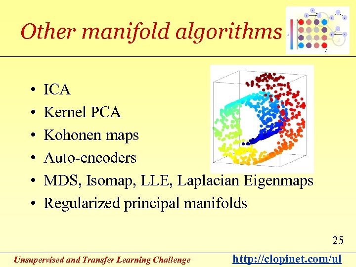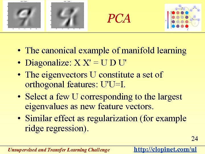 PCA • The canonical example of manifold learning • Diagonalize: X X' = U D U' • The eigenvectors U constitute a set of orthogonal features: U'U=I. • Select a few U corresponding to the largest eigenvalues as new feature vectors. • Similar effect as regularization (for example ridge regression). 24 Unsupervised and Transfer Learning Challenge http: //clopinet. com/ul