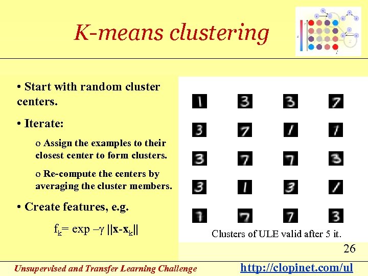 K-means clustering • Start with random cluster centers. • Iterate: o Assign the examples to their closest center to form clusters. o Re-compute the centers by averaging the cluster members. • Create features, e. g. fk= exp –g ||x-xk|| Clusters of ULE valid after 5 it. 26 Unsupervised and Transfer Learning Challenge http: //clopinet. com/ul