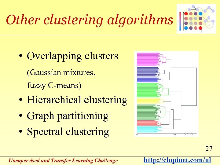 Other clustering algorithms • Overlapping clusters (Gaussian mixtures, fuzzy C-means) • Hierarchical clustering • Graph partitioning • Spectral clustering 27 Unsupervised and Transfer Learning Challenge http: //clopinet. com/ul