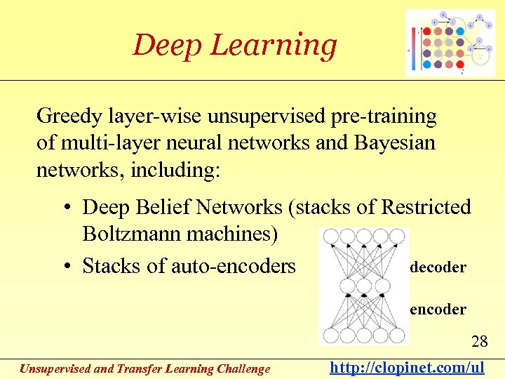 Deep Learning Greedy layer-wise unsupervised pre-training of multi-layer neural networks and Bayesian networks, including: • Deep Belief Networks (stacks of Restricted Boltzmann machines) decoder • Stacks of auto-encoders encoder 28 Unsupervised and Transfer Learning Challenge http: //clopinet. com/ul