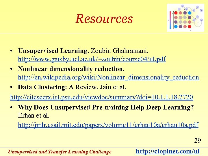 Resources • Unsupervised Learning. Zoubin Ghahramani. http: //www. gatsby. ucl. ac. uk/~zoubin/course 04/ul. pdf • Nonlinear dimensionality reduction. http: //en. wikipedia. org/wiki/Nonlinear_dimensionality_reduction • Data Clustering: A Review. Jain et al. http: //citeseerx. ist. psu. edu/viewdoc/summary? doi=10. 1. 1. 18. 2720 • Why Does Unsupervised Pre-training Help Deep Learning? Erhan et al. http: //jmlr. csail. mit. edu/papers/volume 11/erhan 10 a. pdf 29 Unsupervised and Transfer Learning Challenge http: //clopinet. com/ul