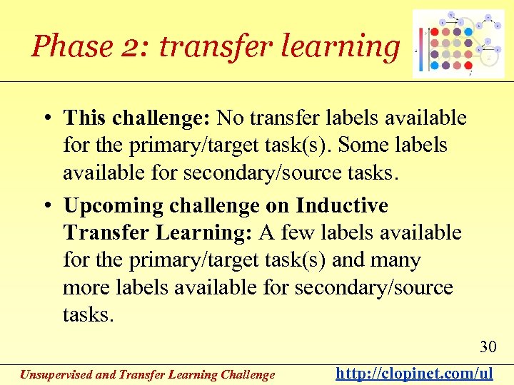 Phase 2: transfer learning • This challenge: No transfer labels available for the primary/target task(s). Some labels available for secondary/source tasks. • Upcoming challenge on Inductive Transfer Learning: A few labels available for the primary/target task(s) and many more labels available for secondary/source tasks. 30 Unsupervised and Transfer Learning Challenge http: //clopinet. com/ul