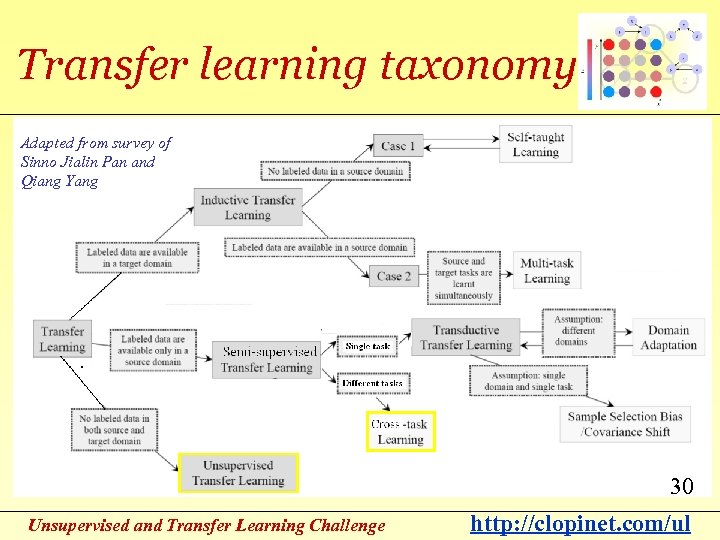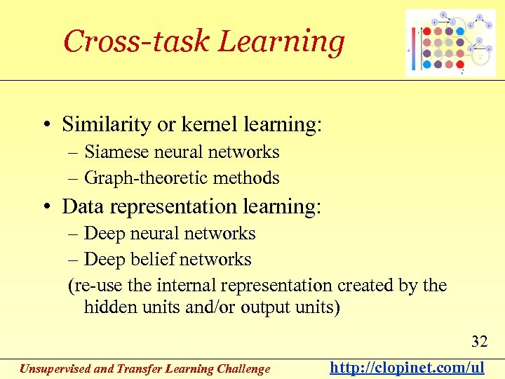 Transfer learning taxonomy Adapted from survey of Sinno Jialin Pan and Qiang Yang 31 30 Unsupervised and Transfer Learning Challenge http: //clopinet. com/ul