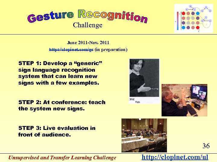 Dec 2010 -March 2011 http: //clopinet. com/ul Competitors Development data Type 1 Labels Validation data Final evaluation data Unsupervised and Transfer Learning Challenge • Prizes: $6000 + free registrations + travel awards • Dissemination: Workshops at ICML and IJCNN; proceedings in JMLR W&CP. Type 2 Labels Type 3 Labels Evaluators 34 http: //clopinet. com/ul