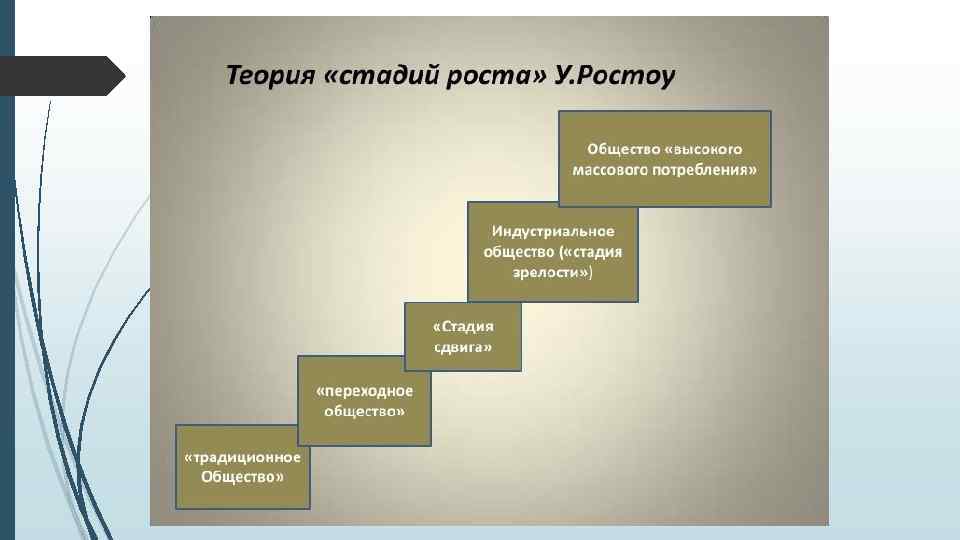 Теория стадий экономического роста У. Ростоу Наиболее известные теоретические концепции были разработаны У. Ростоу в конце 1950 -х — начале 1960 -х ещё до его ухода в политику. Развивая идеи, впервые выдвинутые в 1940 х П. Друкером, Дж. К. Гэлбрейтом и Р. Ароном, У. Ростоу стал одним из разработчиков теории постиндустриального общества. Если его предшественники обращали основное внимание на перерастание индустриального общества в постиндустриальное, то Ростоу изучал прежде всего формирование индустриального общества. Теорию стадий развития экономики он изложил в своей самой знаменитой книге, которая так и называлась — «Стадии экономического роста. Некоммунистический манифест» (1960)